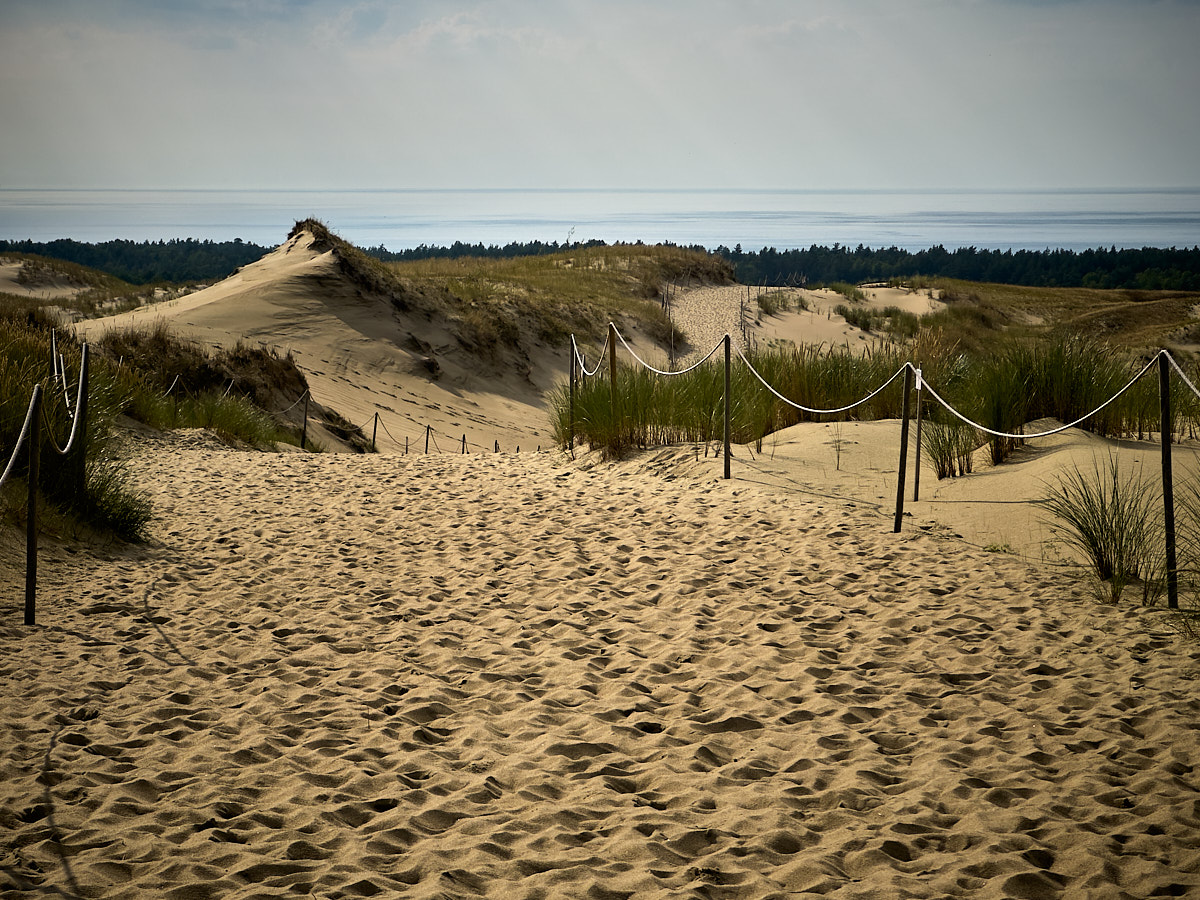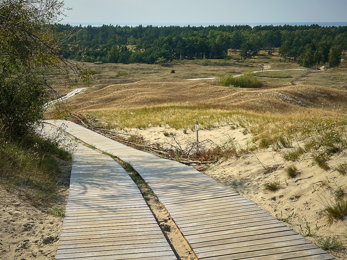 Ich hatte mich zum Wandern auf die Naglių kopa entschieden. Zuvor musste ich aber meinen Obolus zur Erhaltung der Umwelt entrichten und kam zu einer Vergünstigung als „Senior“ (über 65 Jahre alt). Zunächst sind entlang des abgegrenzten Weges Bohlen ausgelegt, danach geht es durch den Sand. Am Ende des Weges, an der höchsten Stelle, steht eine Aussichtsplattform, die einen vorzüglichen Überblick bietet über die Nehrung, mit Sicht auf und über das Haff, die Dünen und die Ostsee.
