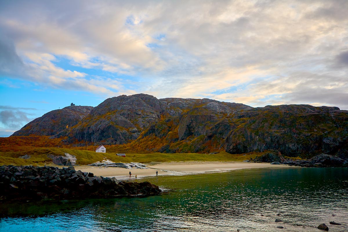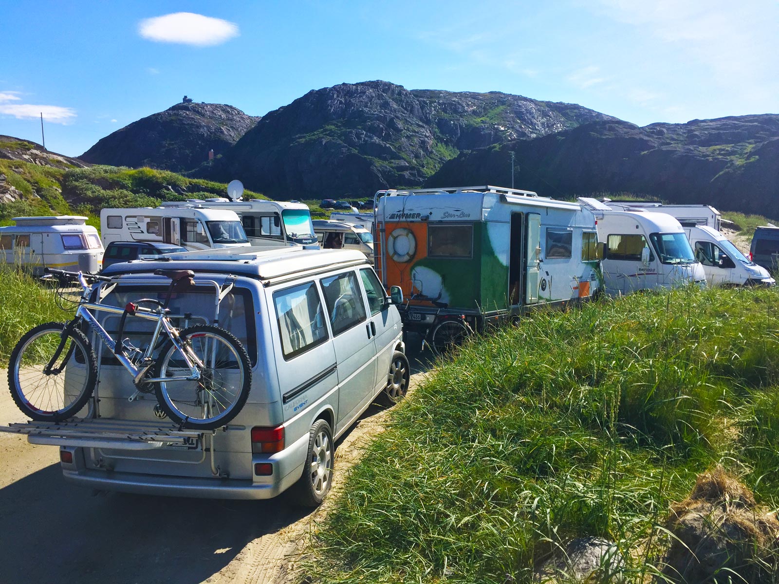 Das Tal weitet sich dann etwas zur Mündung des Jakobselv hin und hinter der letzten Kurve erwartete mich im Sommer 2018 ein Kulturschock. Wenn vorher das Gefühl zunahm, nunmehr so ziemlich am Ende der westlichen Welt zu sein, war jetzt der kleine Platz buchstäblich mit Wohnmobilen aller Art zugepflastert. Ich musste mich mit meinem Bus schon deutlich an den Rand quetschen, um nicht im Weg zu stehen.