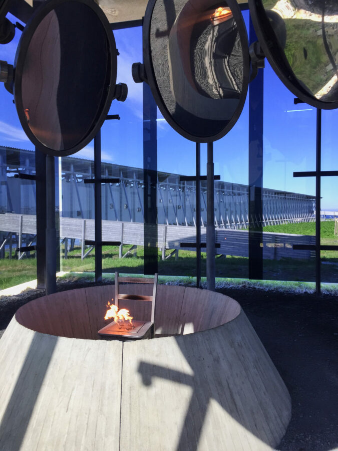 Und in der Installation des angrenzenden Pavillons züngelt ständig eine Flamme aus einem Stuhl und wird in sieben hochgehängten großen Spiegeln verzerrt vervielfacht.